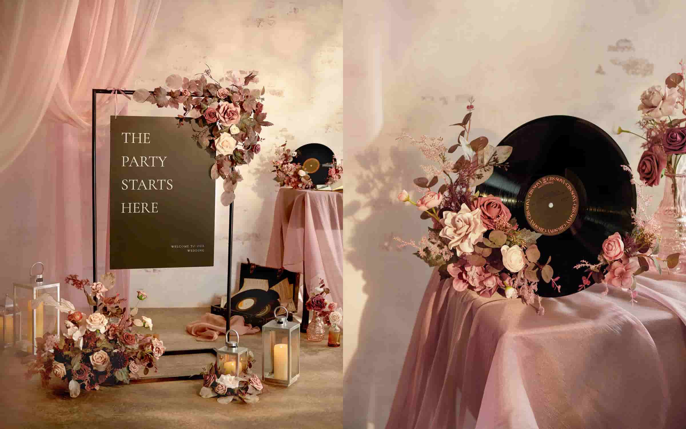 The morning feels like a quiet overture. Silver heels, boutonnieres, and vintage details rest beside the bouquet—roses, calla lilies, and orchids arranged in flowing rhythm. The contrast between pale florals and the dark vinyl mirrors the balance of elegance and emotion, setting the tone for a day filled with soft Nostalgic sophistication.
