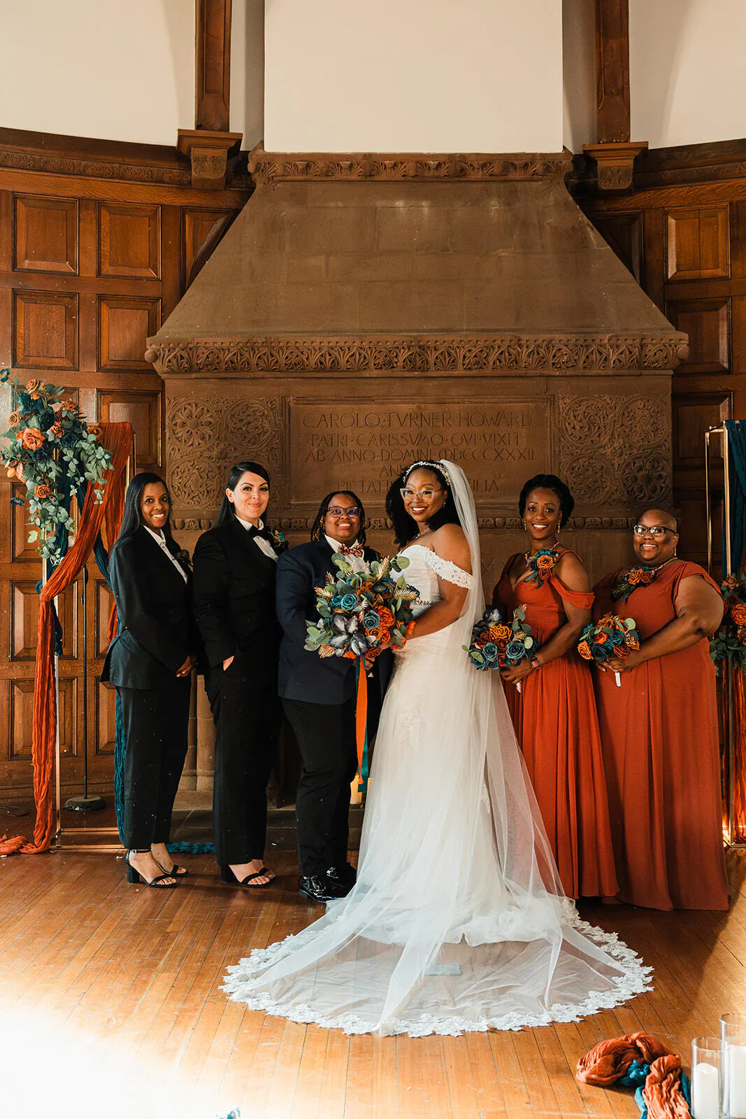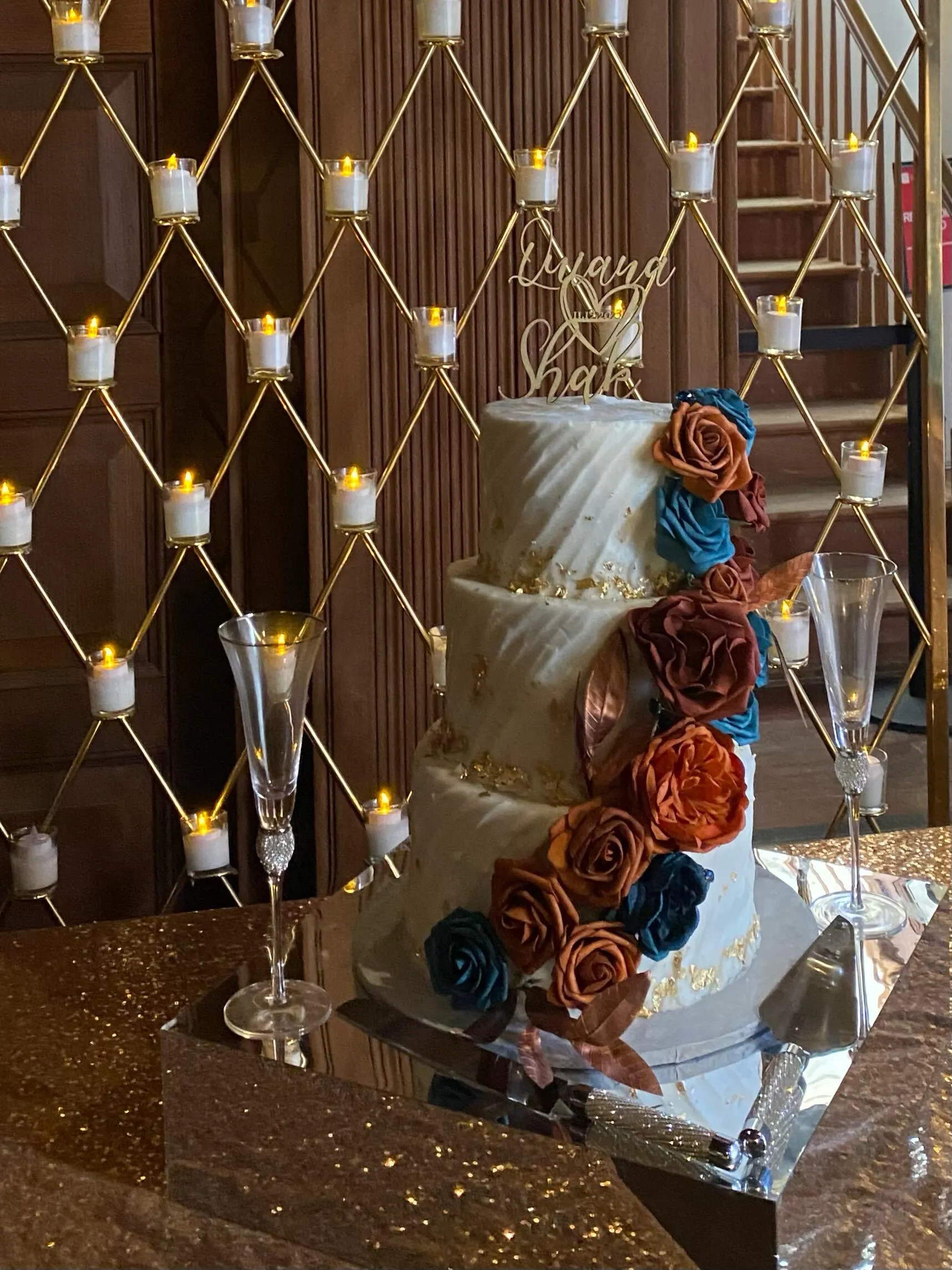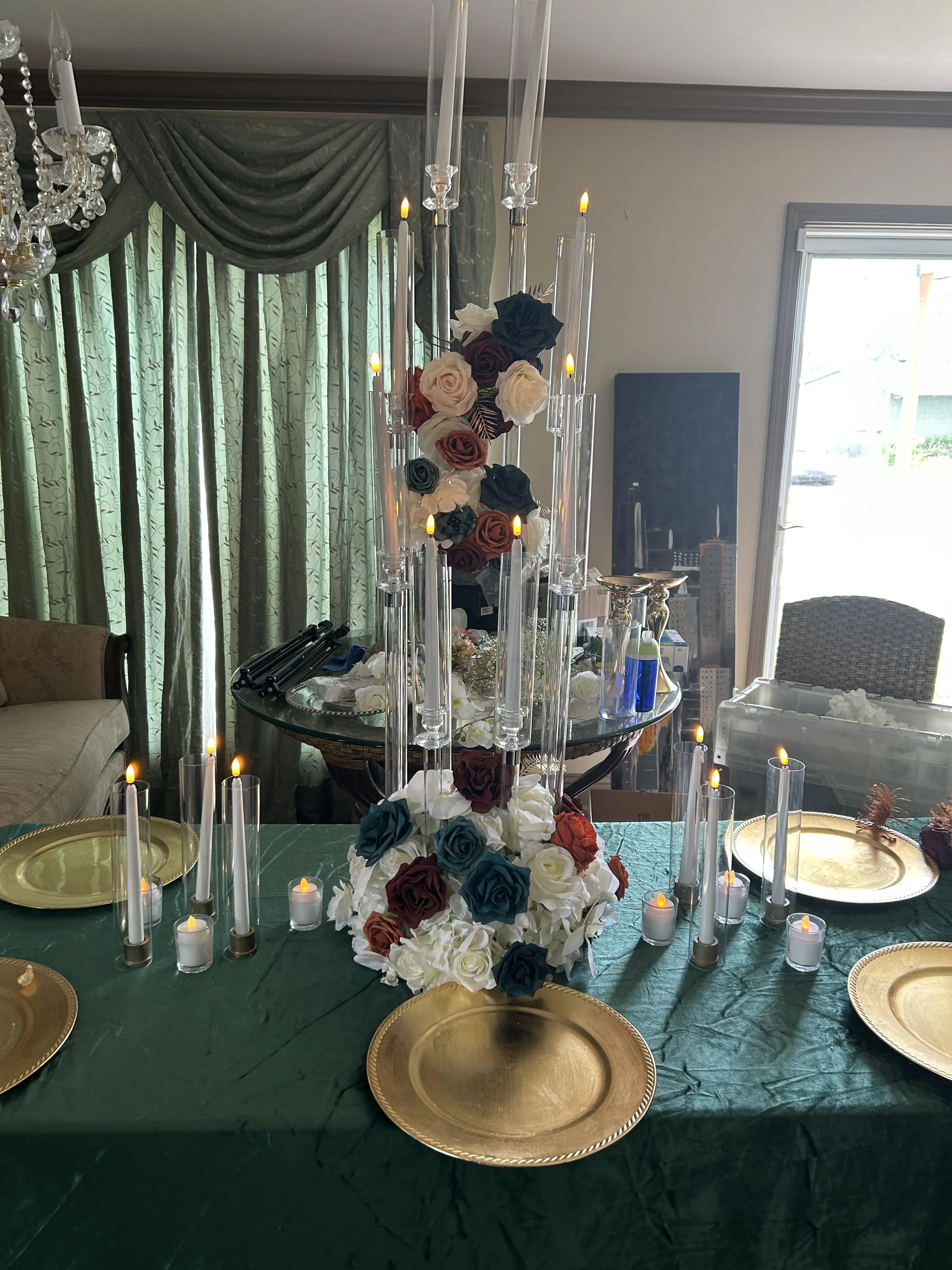- Silk Flowers: Burnt orange Austin rose x1, teal rose x3, orange Cymbidium x3.
