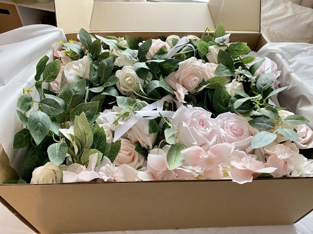- Materials: These flowers are made with realistic silk flowers and foam flowers, every leaf and flower is fixed by hand. Including beautiful and real-looking cream and petal pink foam rose, petal pink silk vendela rose, white baby's breath, some white and pink filler flowers, with sage green rose vine.