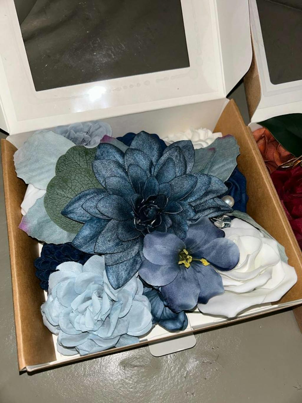 - Silk flowers: Blue Hydrangea x1, Blue Chanel Flower x1, Blue Morning Glory Flower x1