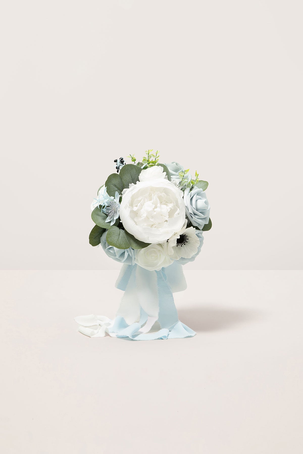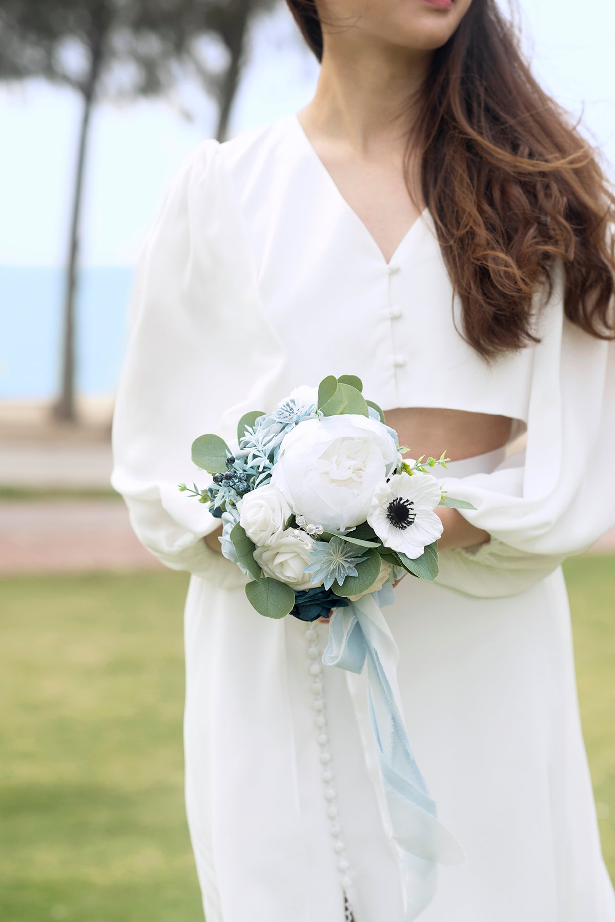 - Set of 4: bridesmaid bouquet x4 (Approx. 7" wide by 13" tall) + ribbon x8 (1.5Yd/pc, including light blue x4, white x4)